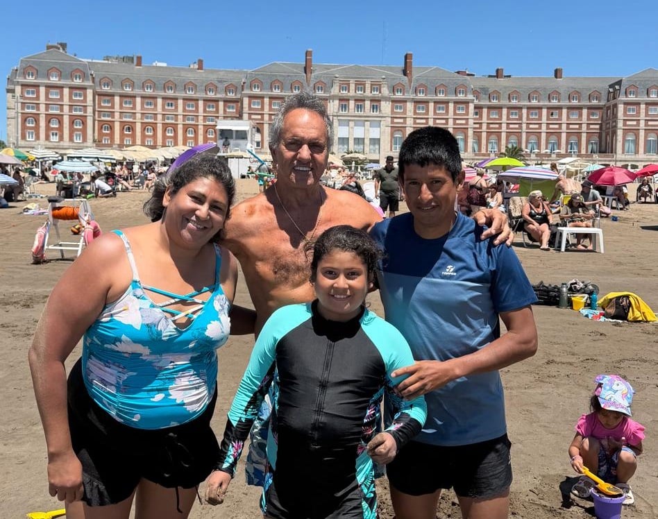 La gente le pidió fotos y Scioli se detuvo a saludar y dialogar. Entre los turistas, hubo una familia de Catamarca con quien posó luego de meterse al mar, a quienes les deseó un buen descanso en Mar del Plata.