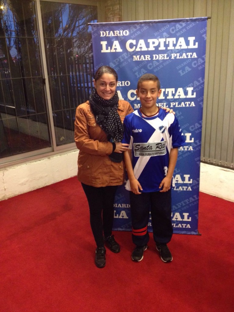 María Fernanda y su hijo Joaquín, ganadores del concurso que realizó LA CAPITAL, pasaron por la redacción para llevarse la camiseta de Alvarado.