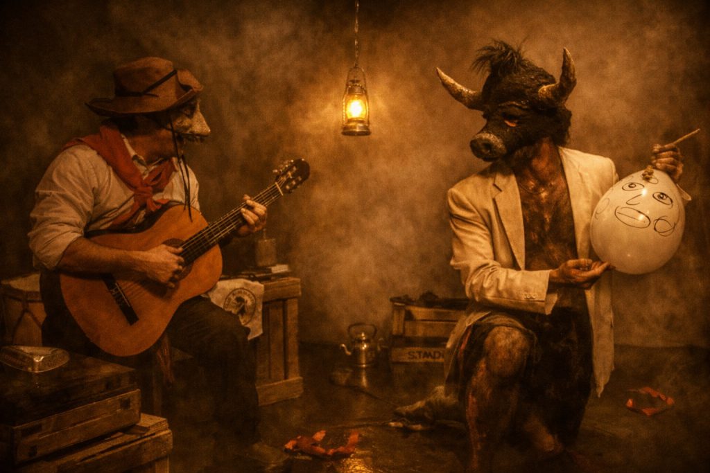 Mena y Moyano, quienes tienen a su cargo la creación de estos personajes únicos, portan máscaras diseñadas y confeccionadas por Leonela Laborde.