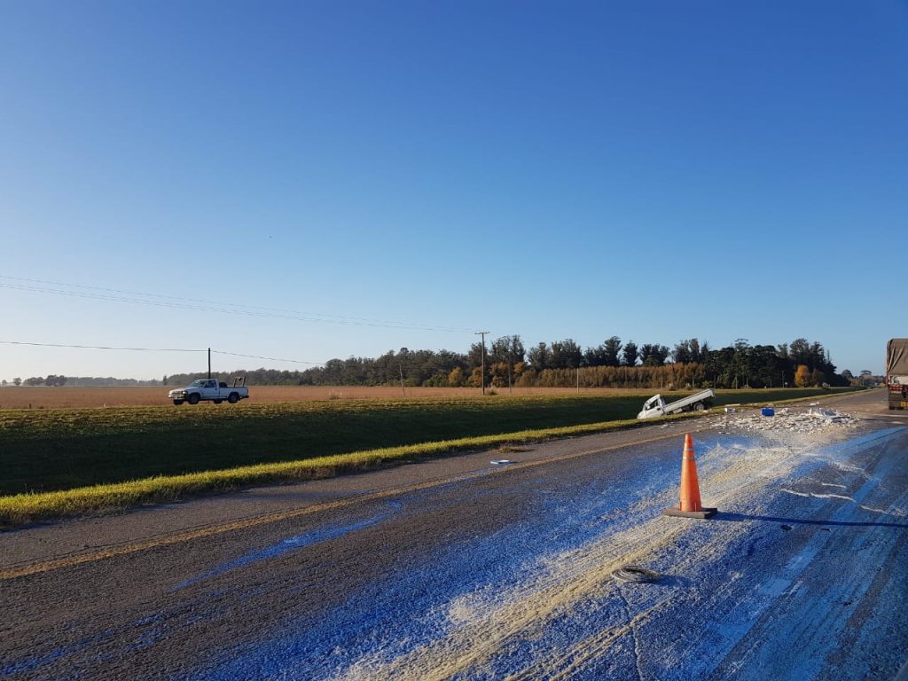 El hecho se produjo en el kilómetro 389 por motivos que se tratan de establecer. Lo llamativo fue que, por la pintura y el resto de materiales que transportaba, la ruta quedó “pintada” con los colores de la bandera argentina.