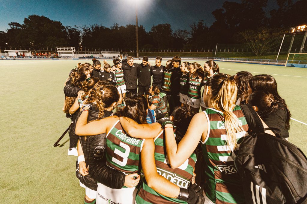 Foto: Cande Suárez Rueda de equipo, con cuerpo técnico y jugadoras de Mar del Plata Club, tras ganar su semifinal.