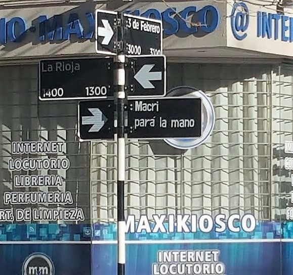 "Macri, para la mano" se puede leer en un letrero ubicado sobre la intersección de 3 de Febrero y La Rioja.