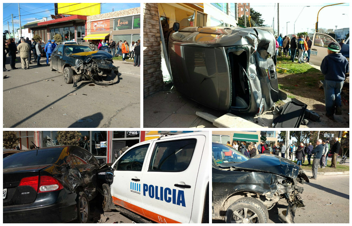 Ocurrió en avenida Constitución y Millán. Un patrullero chocó con un VW Gol. Por el impacto fueron alcanzados otros tres vehículos y hasta un ciclista. Uno de ellos rompió la vidriera de un local comercial y quedó volcado.