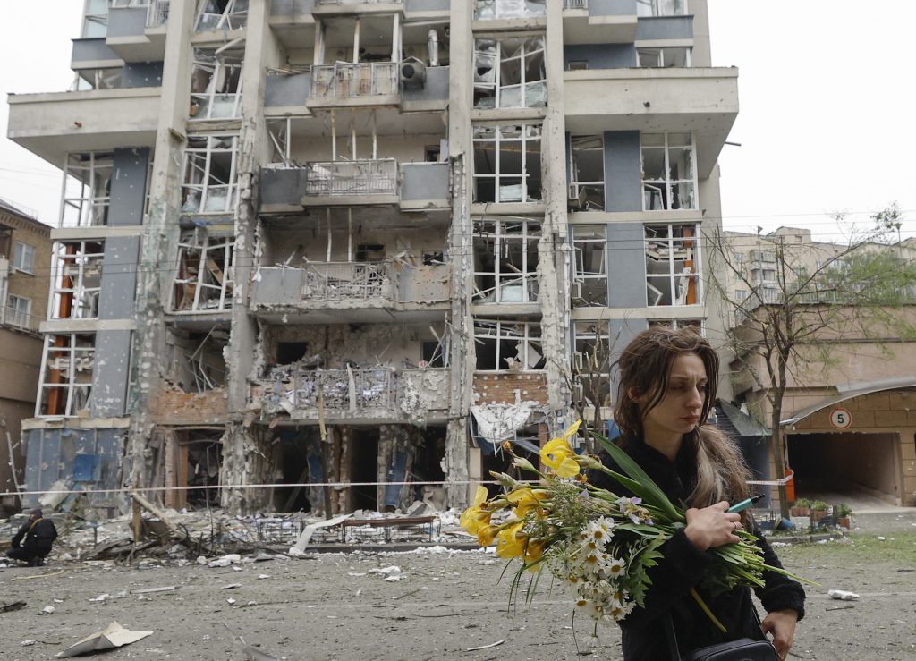 Una mujer pasa junto a un edificio alcanzado por un tras un ataque nocturno, en Kiev. Foto: EFE | Sergey Dolzhenko.