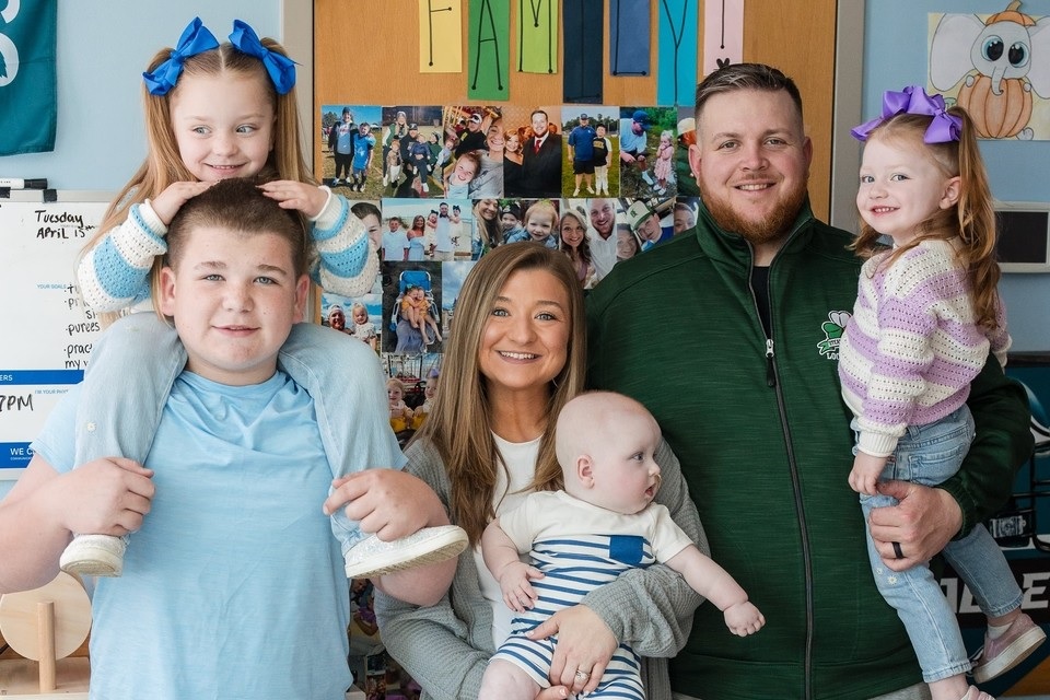 KJ junto a sus padres, Kyle y Nicole, y sus hermanos en el Hospital de Niños de Filadelfia.