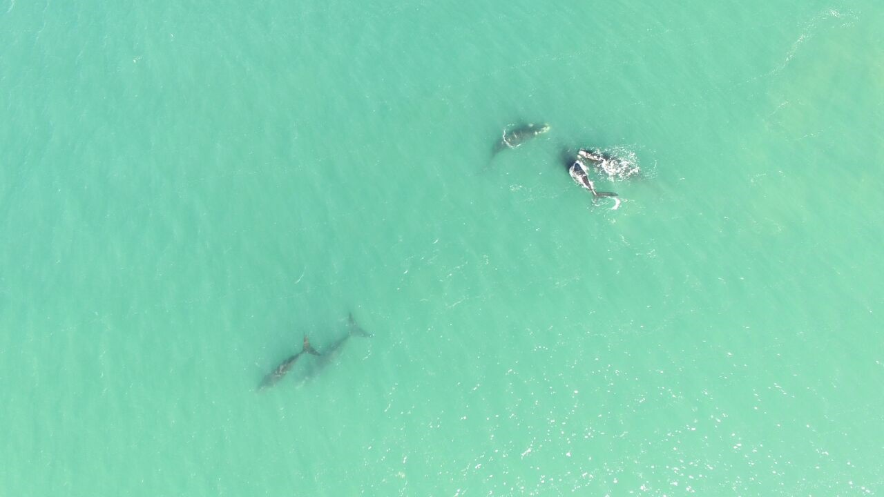 Los cetáceos pudieron verse a la altura del balneario Luna Roja y desde un dron fueron captadas. Mirá las fotos y los vídeos del increíble momento.