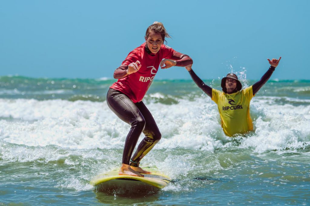 Luego de esa media hora inicial, los aprendices van al mar con todo el equipamiento (traje y tabla especial de material soft para evitar lesiones), siguiendo las instrucciones del profesor y poniendo en práctica la teoría.