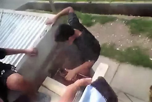 En las imágenes puede observarse como los chicos trepan a un techo de madera y comienzan a saltar. “Esto se va a descontrolar” grita uno de ellos, hasta que la estructura no resiste y caen al suelo.