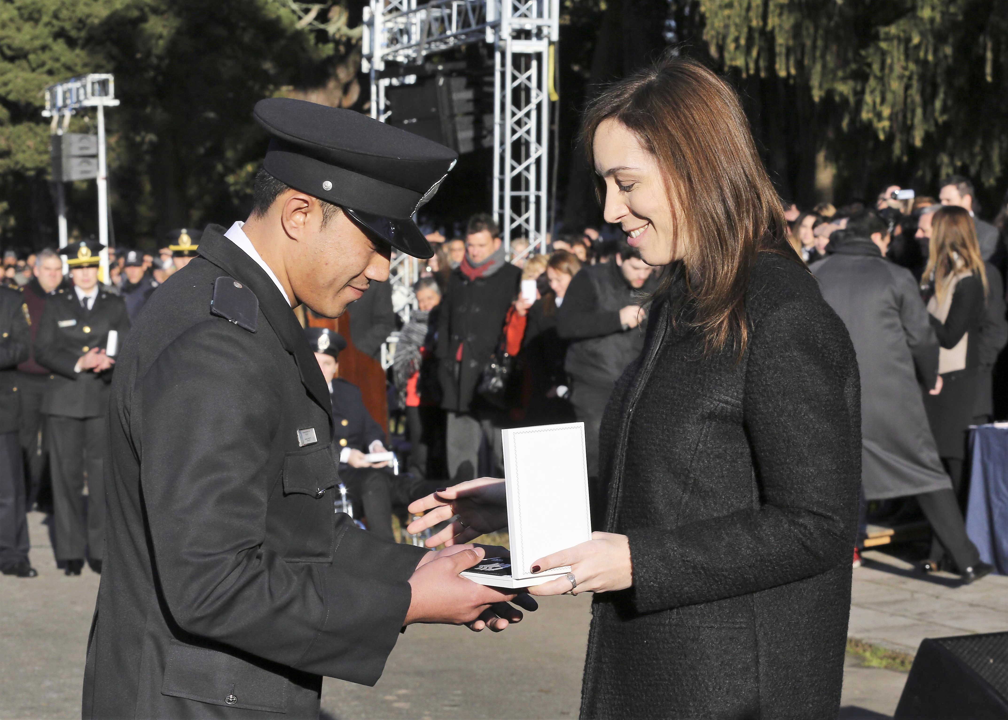 Además, Vidal aprovechó la ocasión para distinguir a los policías bonaerenses que resultaron heridos este verano durante el operativo para recapturar a los hermanos Cristian y Martín Lanatta y Víctor Schillacci, prófugos de la justicia e involucrados en el triple crimen de General Rodríguez.
